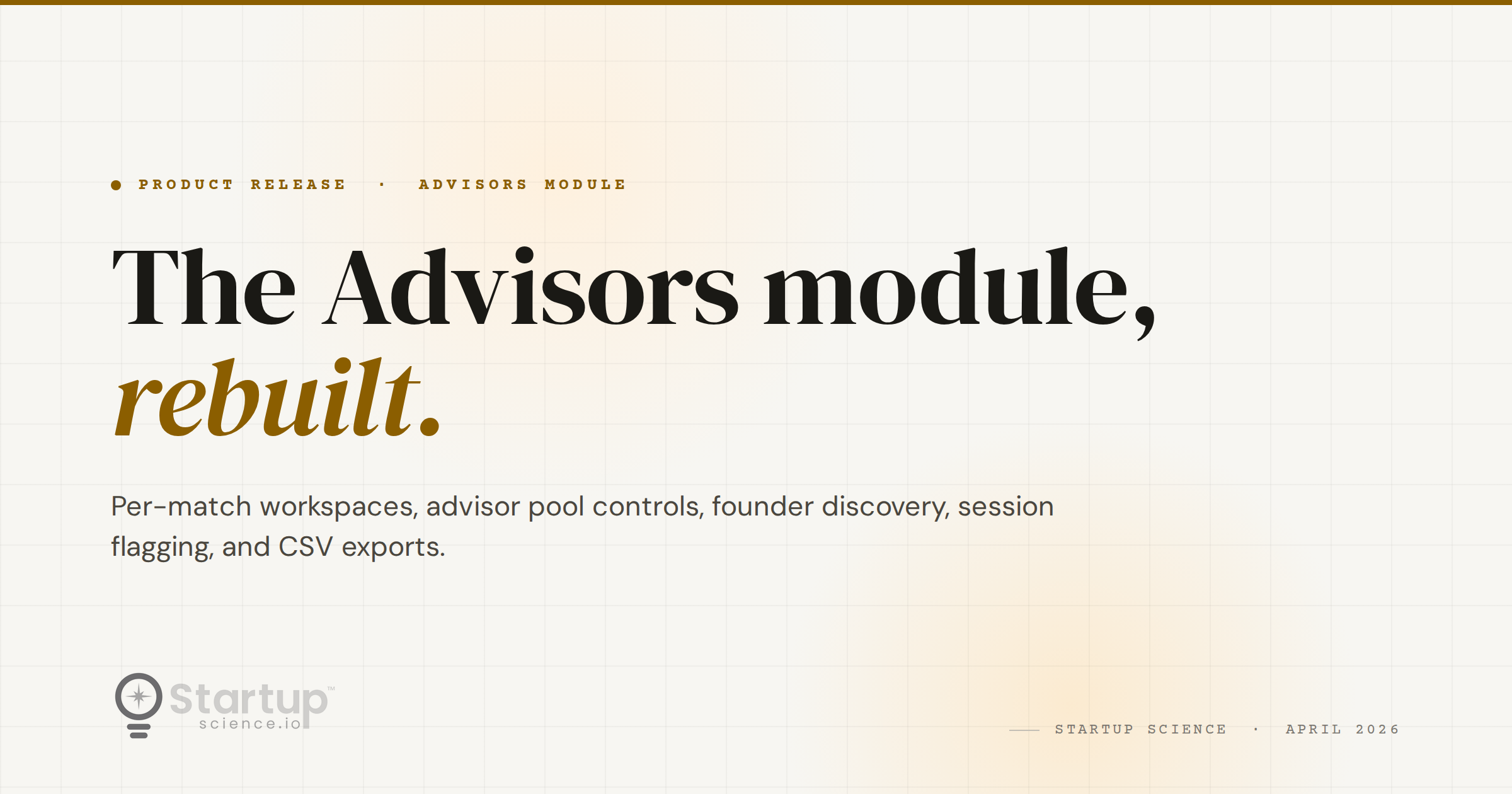 The Advisors module inside Startup Science was built for this exact problem, and this week we shipped its full rebuild. The scope is large enough that it changes how ESO admins, advisors, and founders interact inside the platform. This post walks through what changed, who it matters to, and what we are solving for underneath the surface.